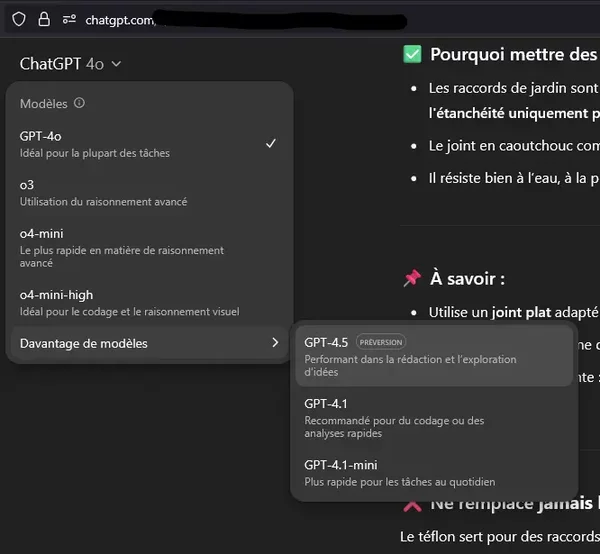 OpenAI propose aussi d’autres modèles moins connus (comme o3, o4-mini ou o4-mini-high, 4.1, 4.1-mini), souvent réservés aux développeurs ou aux entreprises. Ils sont spécialisés dans le raisonnement mathématique, l’analyse de données ou la rédaction empathique.