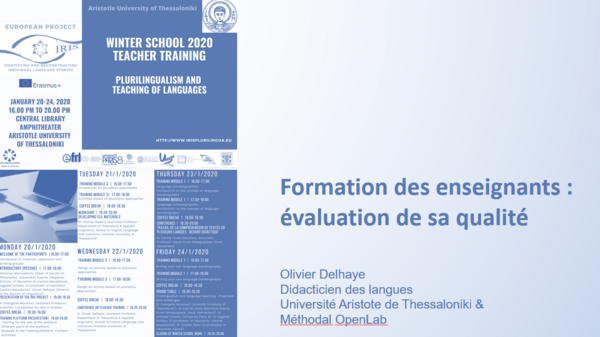 Présenté en janvier 2020 au cours d’une école d’hiver consacrée au plurilinguisme et à l’enseignement des langues, ce diaporama explore des outils et approches permettant d’évaluer la qualité des formations pour enseignants. Bien qu’il date de quelques années, ce travail reste une ressource précieuse pour optimiser les processus d’apprentissage et d’enseignement.