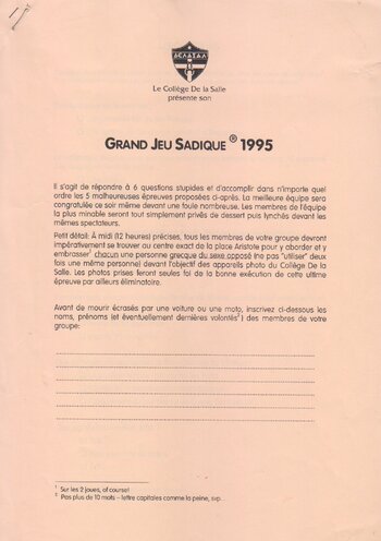 Il s’agit de répondre à 6 questions stupides et d’accomplir, dans n’importe quel ordre, les 5 malheureuses épreuves proposées ci-après. La meilleure équipe sera congratulée ce soir même devant une foule nombreuse. Les membres de l’équipe la plus minable seront tout simplement privés de dessert puis lynchés devant les mêmes spectateurs.